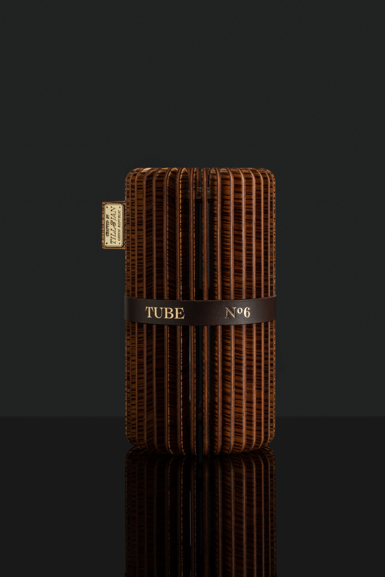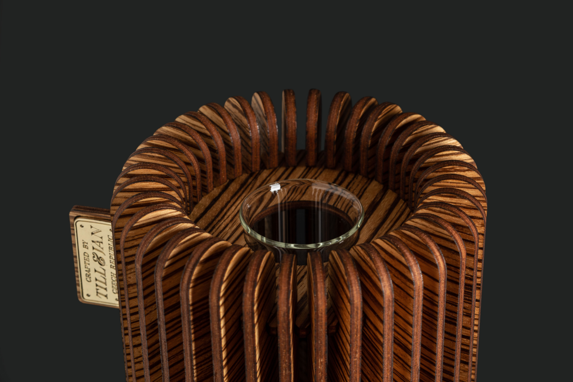 Tělo: Dýha ošetřená olejovoskem Pásek: Kožený s ražbou Štítek: Odlévaný kovový s galv. úpravou Nádobka: Skleněná ø 40 mm